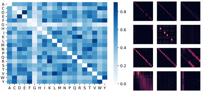 左侧 :使用注意力权重估计的氨基酸相似性矩阵。在仅访问了蛋白质序列且无需事先了解生物化学信息的情况下,该模型可以识别高度相似的氨基酸对,例如 (D,E) 和 (F,Y)。中间:通过 BPT1_BOVIN 蛋白质的 4 层(行)和 3 个选定的头(列)建立的注意力矩阵,显示了局部和全局注意力模式