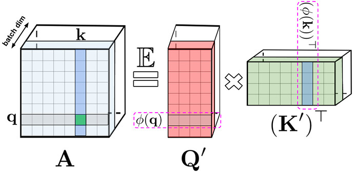 左侧 :标准注意力矩阵,包含每一对条目的所有相似性得分(通过对 query 和 key 进行 softmax 运算得到),表示为q 和 k;右侧:标准注意力矩阵可通过低秩的随机矩阵 Q′ 和 K′ 来近似,其中的行对原始 query/key 的潜在随机非线性函数进行编码。对于常规的 softmax-attention,该转换非常紧凑,并且涉及指数函数以及随机高斯投影