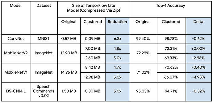 通过在几个主流模型上进行实验,证明了权重聚类的压缩优势。还可以采用更激进的优化,但会牺牲准确率。虽然下表仅为 TensorFlow Lite 模型的测量结果,但对于 SavedModel 等其他序列化格式的益处也显而易见。